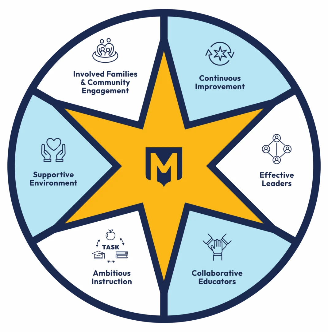 Meridian Charter Schools academic model is grounded in the 5Essentials framework, a research-based approach developed by the University of Chicago Consortium. This model focuses on five key areas proven to drive student success: strong leadership, collaborative teacher culture, meaningful family engagement, supportive school environments, and high academic expectations. These elements don’t just predict strong schools—they define them. We’ve also added a sixth core element: Continuous Improvement—reflecting our belief that every child deserves a school that is always striving to get better. Our decision to anchor the Meridian Model in the 5Essentials reflects our belief in research, action, and shared responsibility.